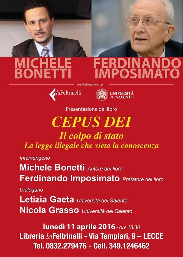 Lunedì 11 aprile, dalle ore 18:30, si terrà a Lecce presso la libreria “La Feltrinelli”, sita in Via dei Templari n. 9, la presentazione del mio libro “Cepus Dei – Il Colpo di Stato – La legge illegale che vieta la conoscenza”. Avrò l’onore di essere al fianco del Presidente Ferdinando Imposimato, che ne ha curato la prefazione.