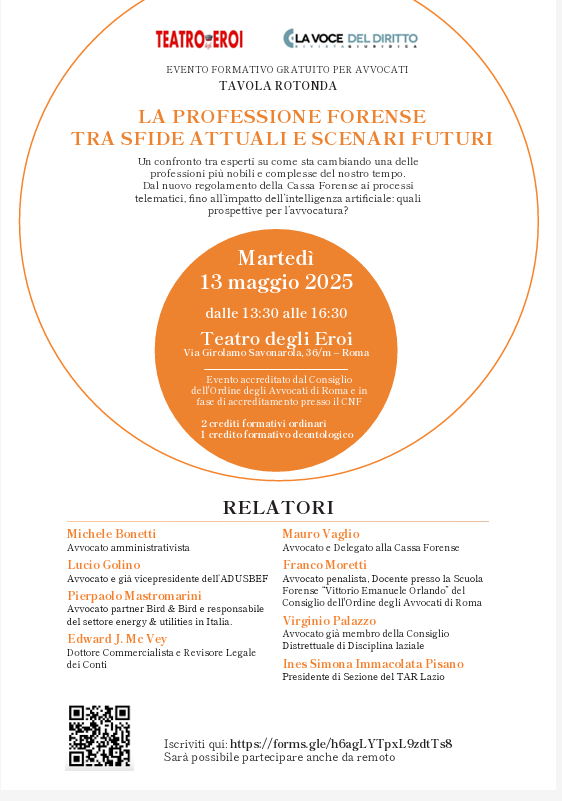 L’evento, tenutosi martedì 13 maggio 2025 presso il Teatro degli Eroi di Roma, è stato gratuito e accreditato dal Consiglio dell’Ordine degli Avvocati di Roma con 2 crediti formativi ordinari e 1 credito deontologico.
