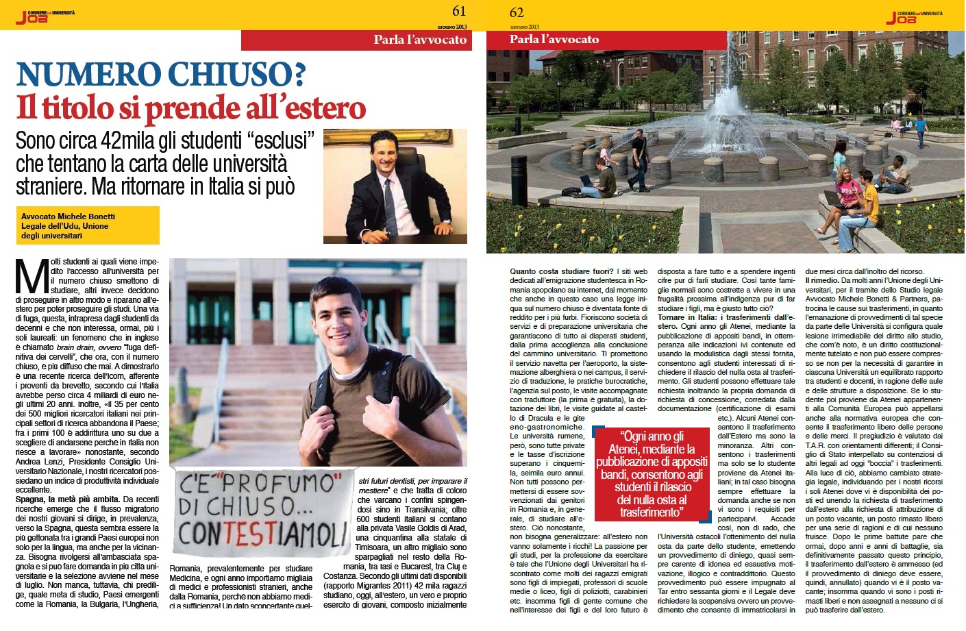 L’avv. Michele Bonetti dell’Unione degli Universitari nella sua rubrica mensile su “il Corriere dell’Università Job” - mensile che propone approfondimenti sulla politica universitaria, con informazioni e guide di orientamento per studenti, docenti e addetti ai lavori - ha affrontato il tema degli studenti che, rimasti esclusi dall’ingresso all’università per il numero chiuso, anziché smettere di studiare, tentano la carta delle università straniere.